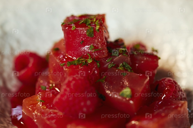 Свежие кубики арбуза и малины, украшенные нарезанной мятой