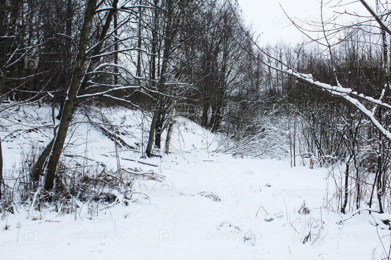Лесной зимний пейзаж. деревья вокруг просвета в лесу