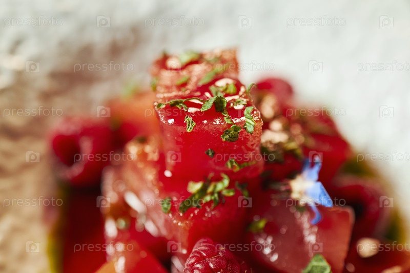 Клюшовый снимок, показывающий свежего набитого тунца, украшенного травами и съедобными цветами