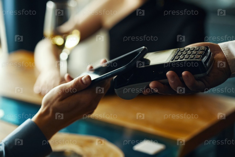 Молодая взрослая женщина платит смартфоном с помощью бесконтактного терминала