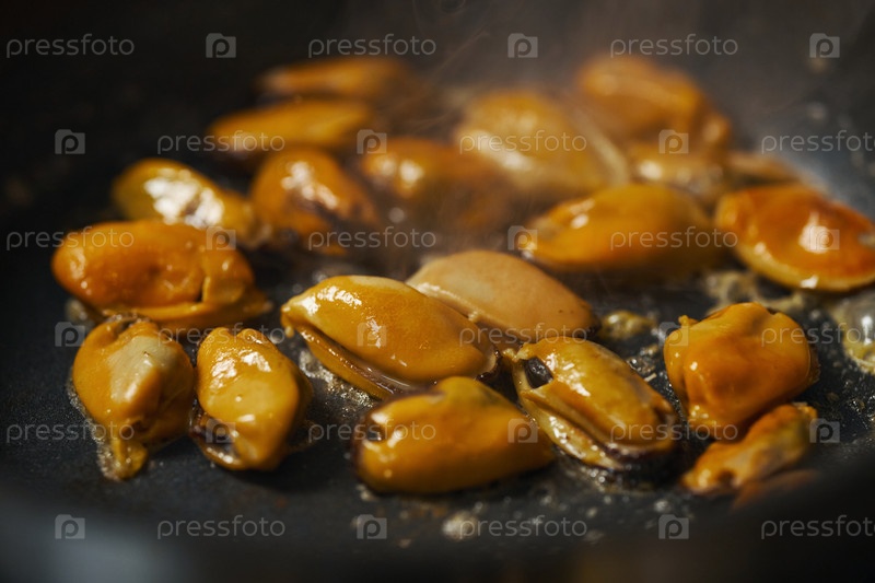 Свежие мидии, готовящиеся в сковороде во время приготовления блюда из морепродуктов