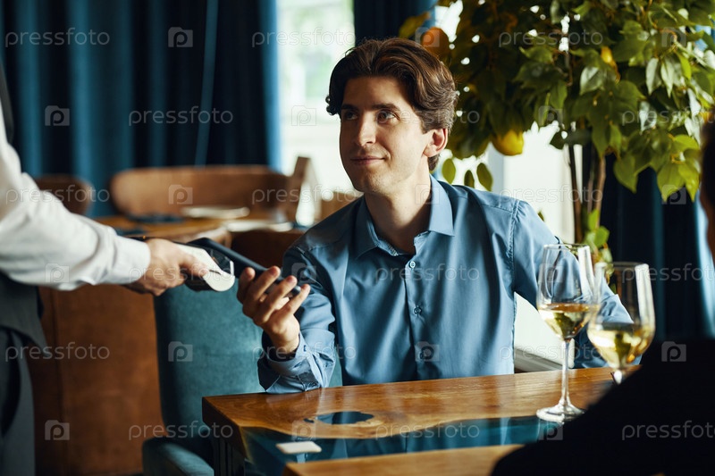 Молодой взрослый мужчина платит счет со смартфоном за столом в ресторане