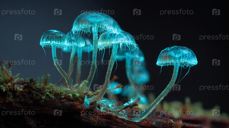 Биолюминесцентные грибы, светящиеся эфирным синим светом на моховом дереве.Мистический пейзаж природы
