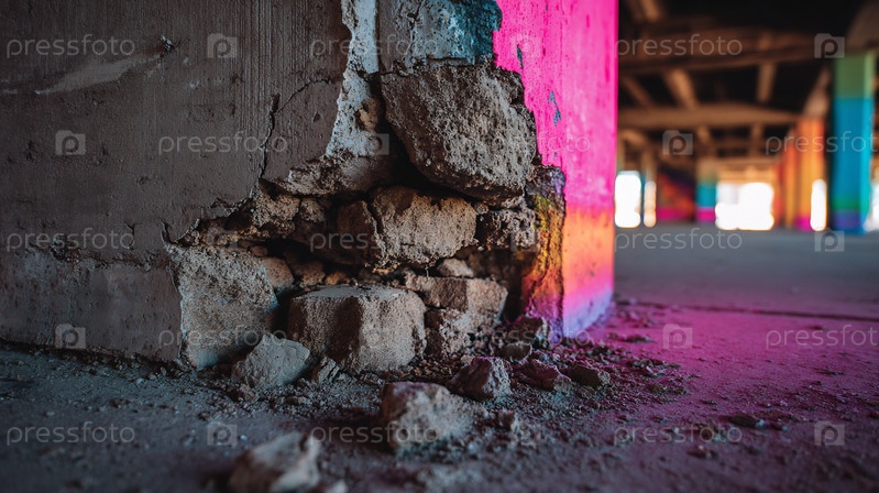 Близкий план поврежденного бетонного столба, окрашенный яркими цветами городских граффити