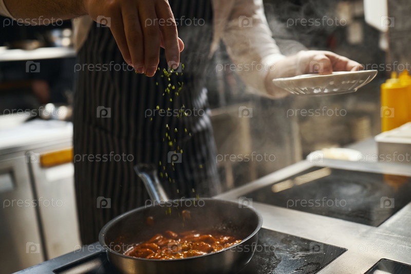 Молодой взрослый мужчина поливает травами во время приготовления пищи, испаряет еду в помещении