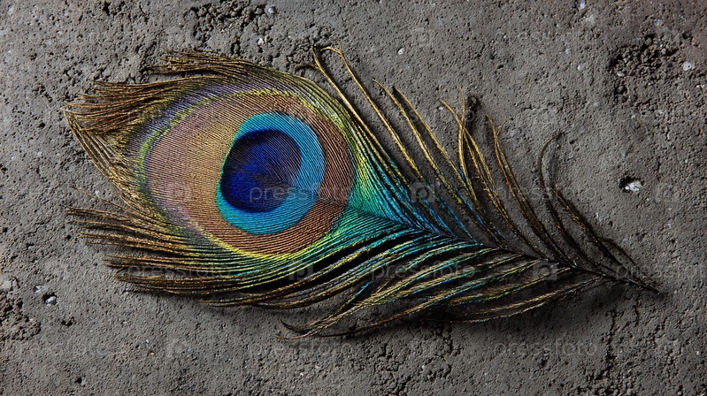 Подробный снимок одного красочного перья павлина, лежащего на текстурированной земле