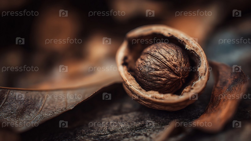 Детальный крупный план одного грецкого ореха внутри его сломанной раковины на естественном фоне