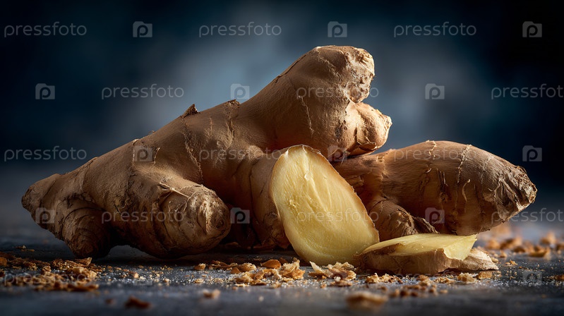 Близкий план свежего корня имбиря, один кусок нарезанный на фонах темной текстуры