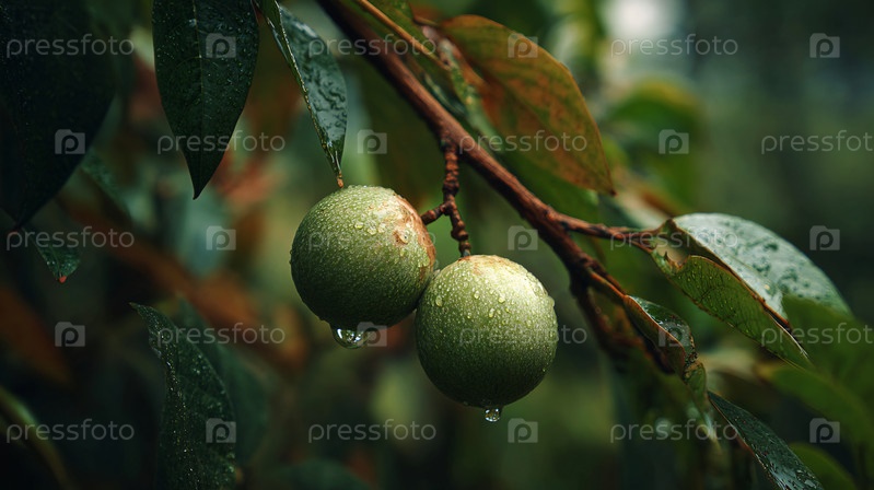 Близкий план двух зеленых фруктов на ветке, покрытой прозрачными капельками дождя
