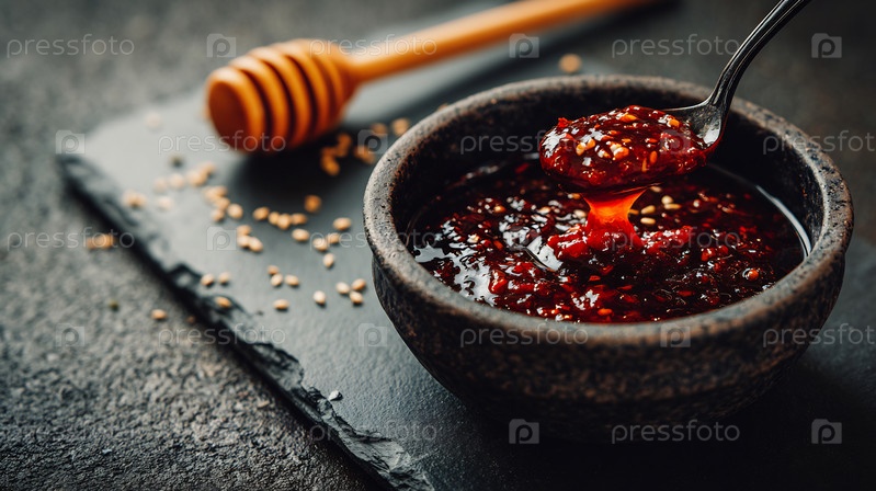 Острый красный соус чили с семенами кунжута в темной таре, готовый к подаче