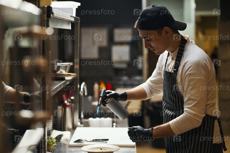 Молодой взрослый мужчина готовит еду с кулинарным факелом на кухне ресторана