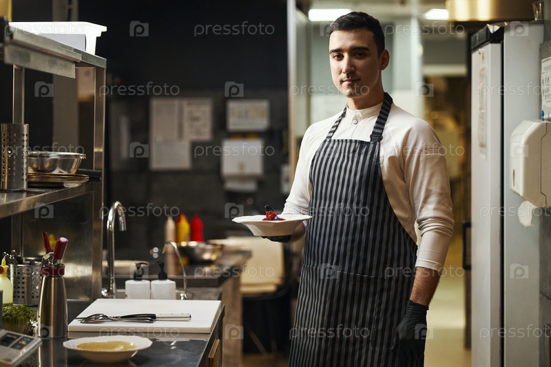 Портрет молодого взрослого мужчины, держащего десертную тарелку на кухне ресторана