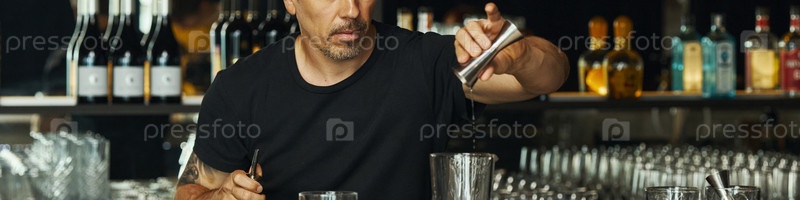 Мужчина средних лет наливает алкоголь в стакан для смешивания за барной стойкой