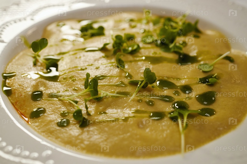 Гурманский кремовый суп, украшенный микрозелеными растениями и смазанным травяным маслом