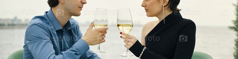Молодой мужчина и женщина тостируют бокалы с вином, сидя на улице