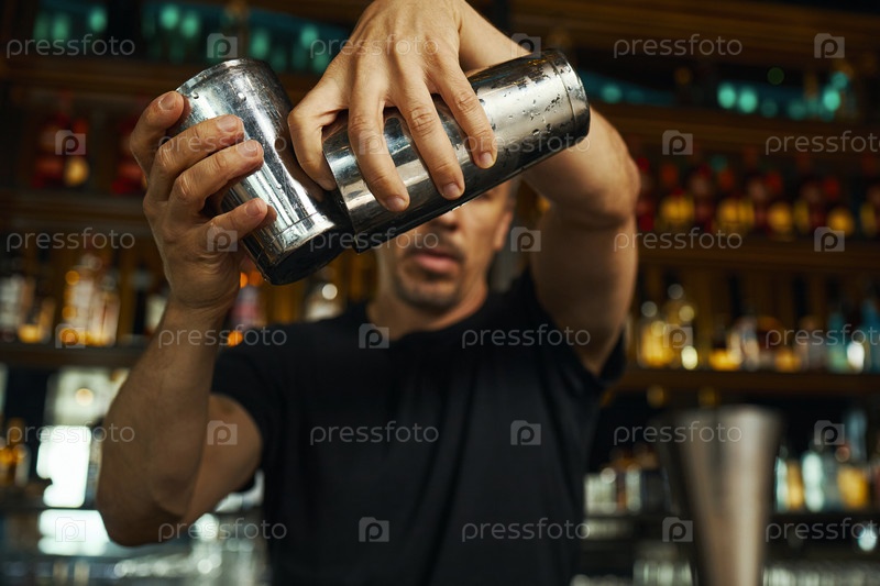 Молодой взрослый мужчина смешивает коктейльный шейкер за барной стойкой