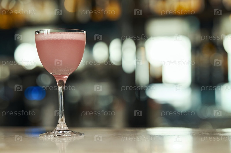 Коктейльное стекло, стоящее на барной стойке в современном ресторане с розовой окраской