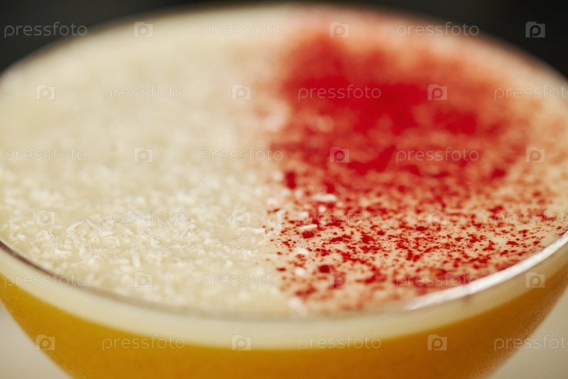 Близкий снимок, показывающий коктейльный стакан с кокосовым и красным порошком