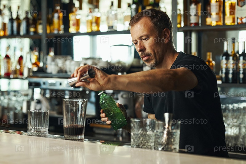Мужчина средних лет смешивает алкогольный напиток за барной стойкой