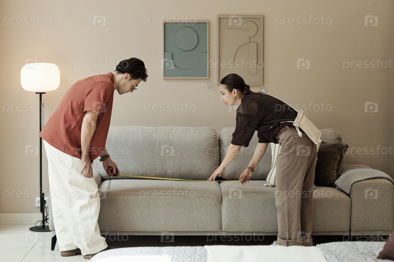 Молодой мужчина и женщина измеряют диван в мебельном магазине