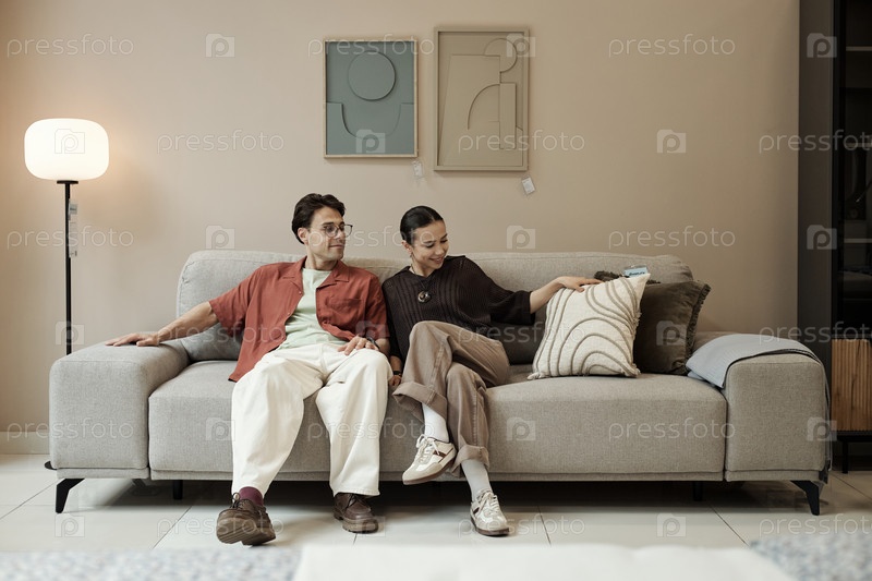Молодой мужчина и молодая женщина отдыхают вместе в мебельном магазине