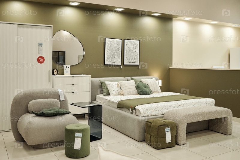 Мебель спальни, отображающая современный дизайн в мебельной лавке Современная обстановка