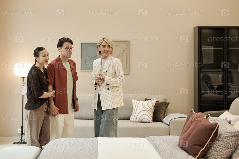 Продавец показывает мебель молодой паре