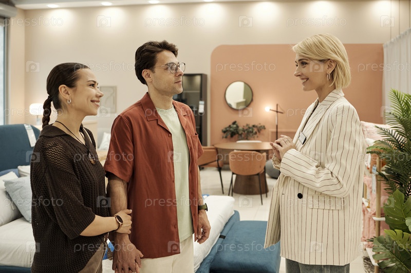 Взрослая женщина приветствует молодую пару в магазине