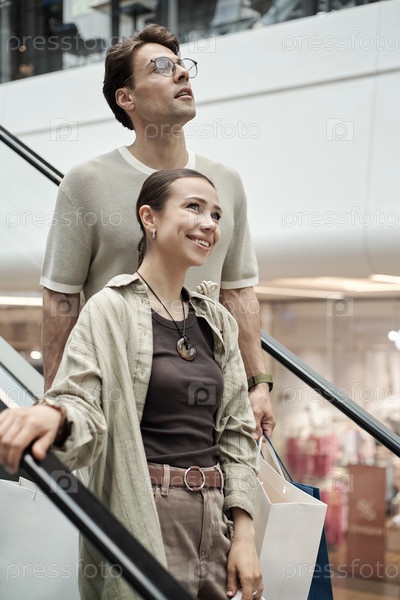 Молодой мужчина и женщина едут по эскалаторам и улыбаются в мебельном магазине