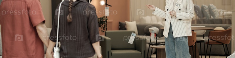 Молодая женщина помогает паре делать покупки внутри мебельного магазина