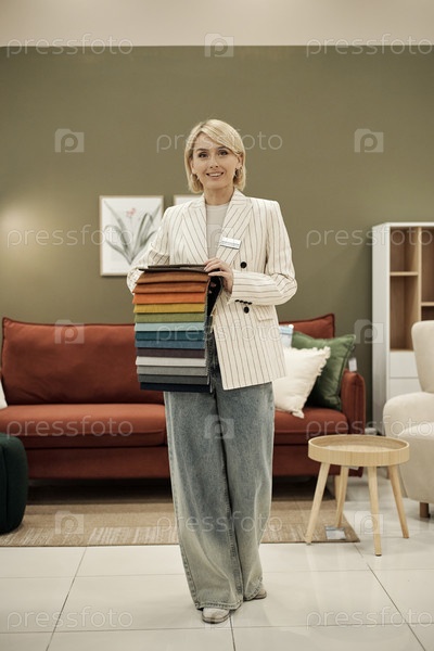 Молодая взрослая женщина представляет образцы ткани в мебельном магазине