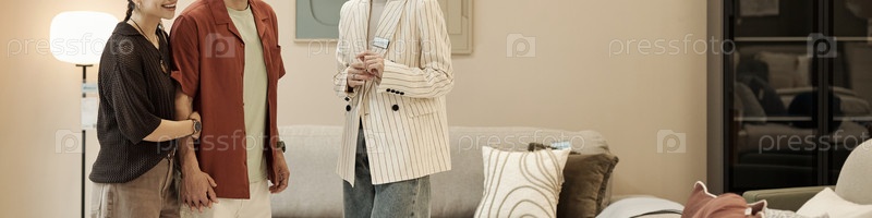 Молодая женщина консультирует молодую пару Покупки в мебельном магазине