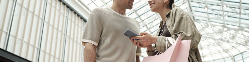 Молодой мужчина и молодая женщина улыбаются, держа смартфон и сумку для покупок
