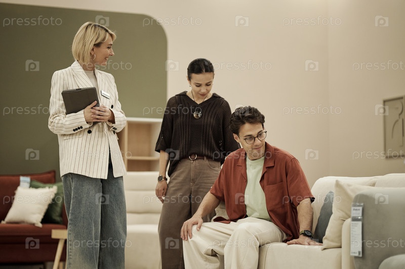 Молодая женщина помогает молодым взрослым выбирать диван
