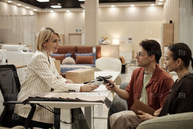 Молодая женщина помогает молодой паре выбирать мебель