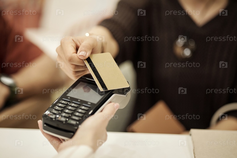 Молодая взрослая женщина делает платеж с помощью кредитной карты в кассе