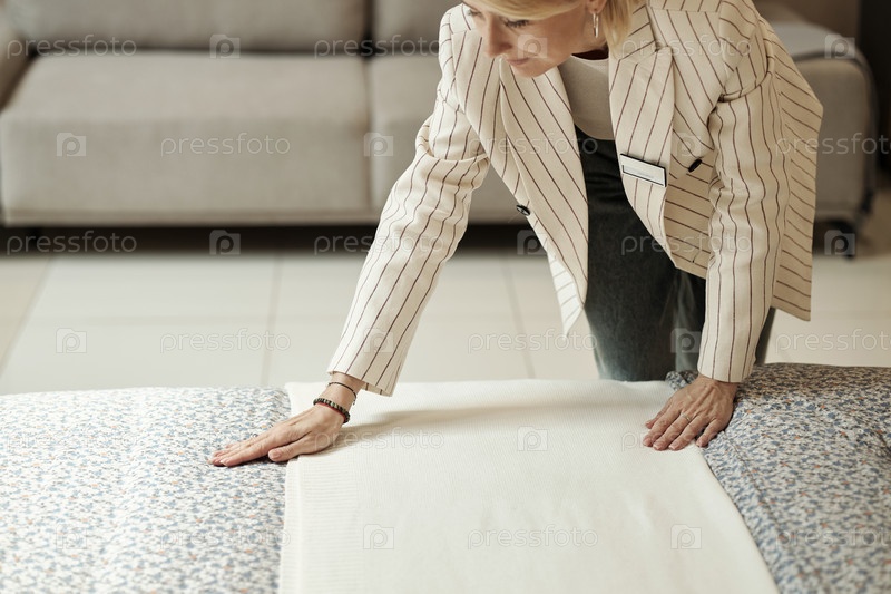 Женщина, устраивающая постельное белье в интерьере мебельного магазина