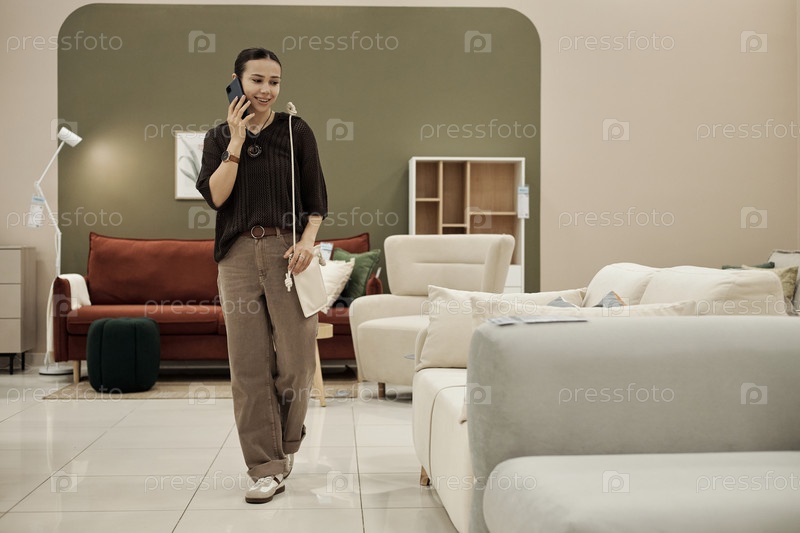 Молодая взрослая женщина улыбается, разговаривая со смартфоном в мебельном магазине