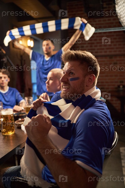Молодые мужчины радуются и празднуют во время просмотра футбольного матча