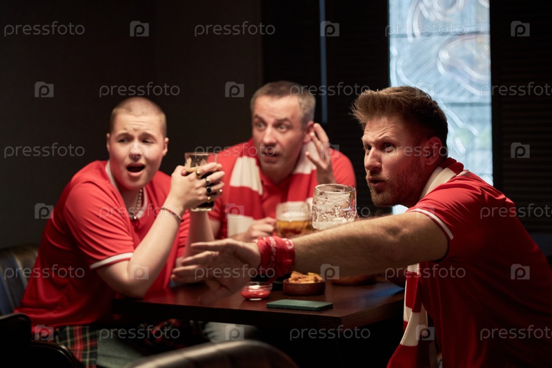 Группа тревожных фанатов, смотрящих футбольный матч и болеющих в баре