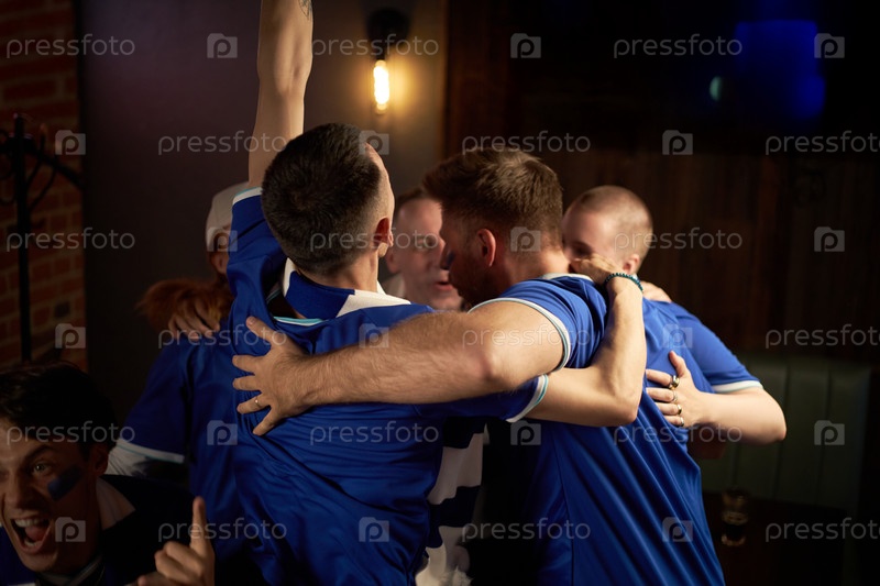 Группа молодых мужских товарищей празднует победу в футболе в спортивном баре