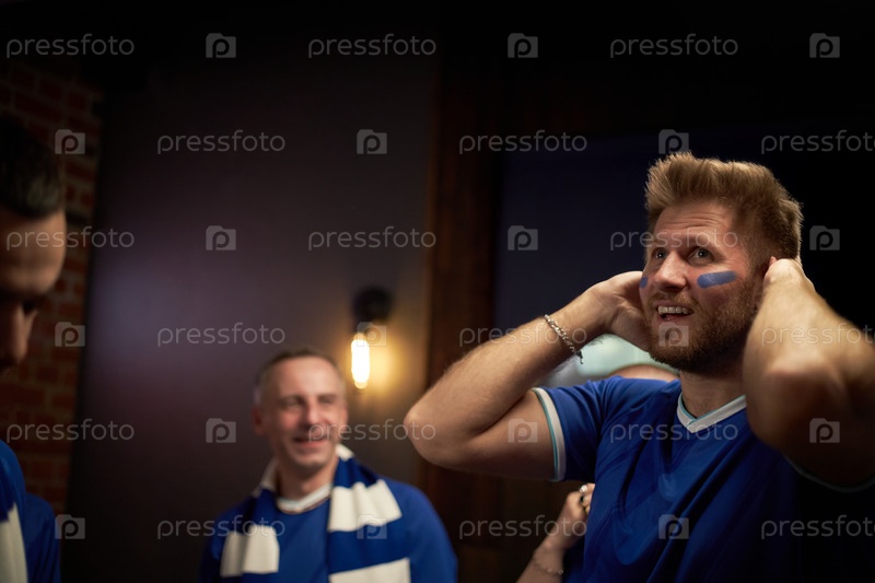 Молодой человек реагирует взволнованно среди футбольных болельщиков внутри дома
