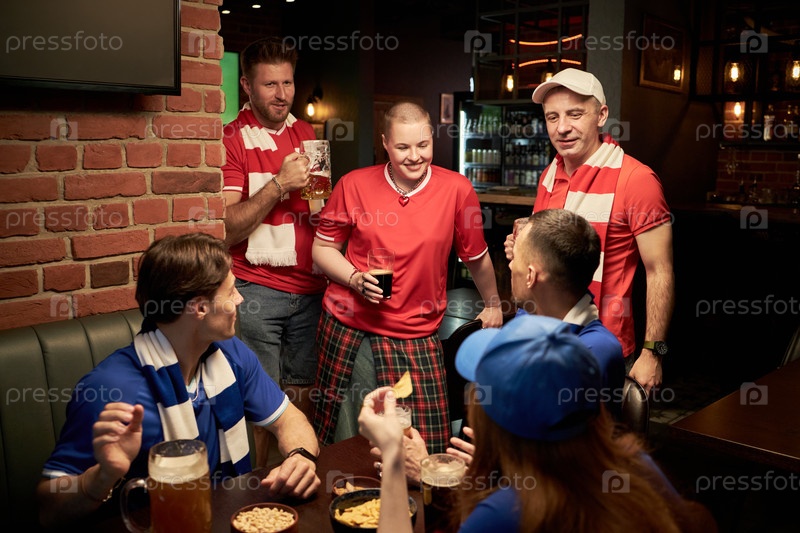 Группа разнообразных юношеских футбольных болельщиков, общающихся и пьющих в спортивном баре