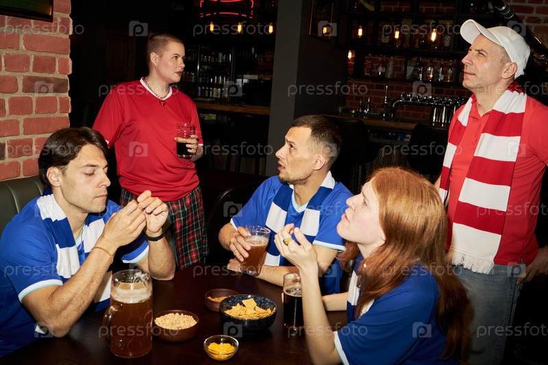 Группа разнообразных молодых футбольных фанатов, смотрящих матч в пабе вместе