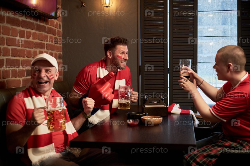 Группа мужчин и женщин, поддерживающих и празднующих футбольный матч в помещении