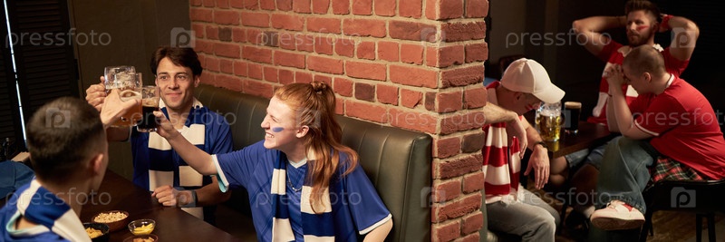 Группа молодых мультиэтнических футбольных болельщиков, поддерживающих и выпивающих пивом