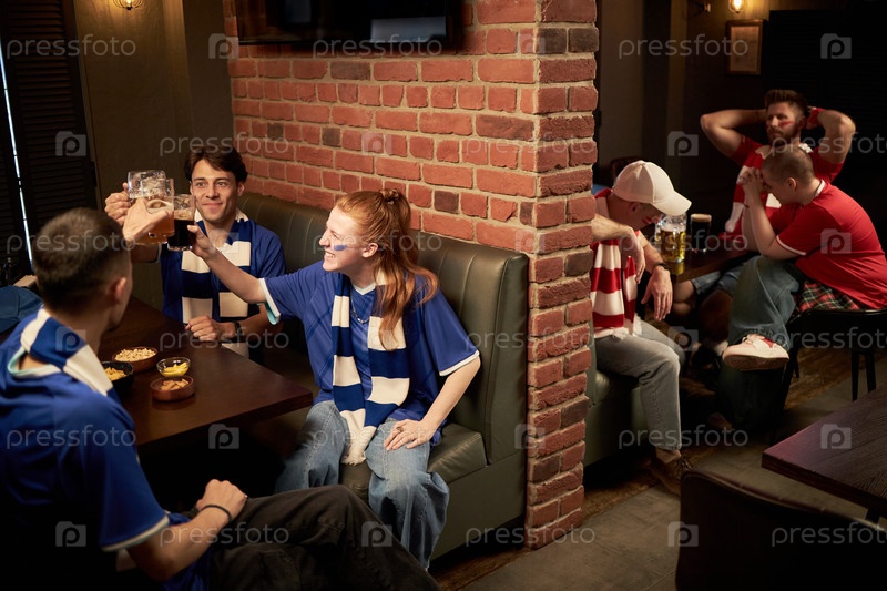 Группа молодых многонациональных болельщиков футбола, празднующих и общающихся в помещении
