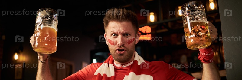 Портрет молодого человека, празднующего футбольный матч с пивными кружками