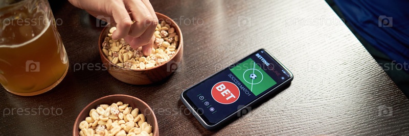 Смартфон с приложением для ставок на столе в баре при футбольном матче