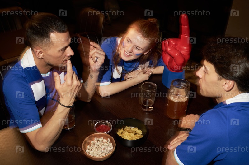 Группа молодых футбольных болельщиков общаются, беседуют и веселятся в Pub